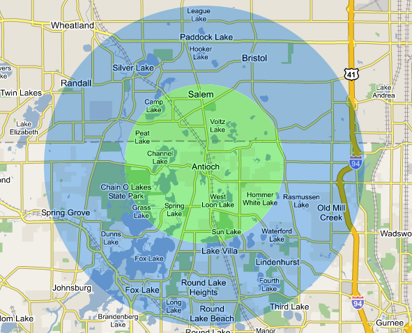 Blue = 8 mile radius (mostly good coverage)